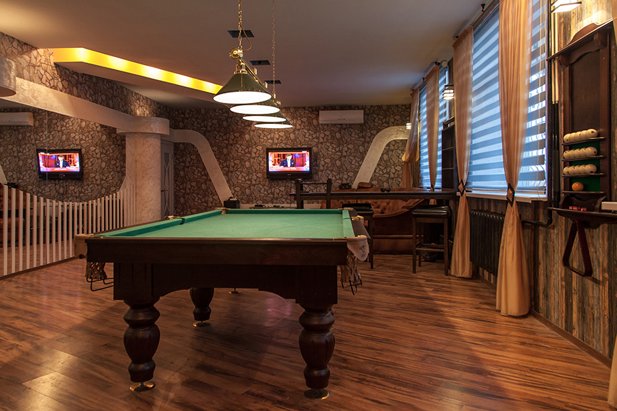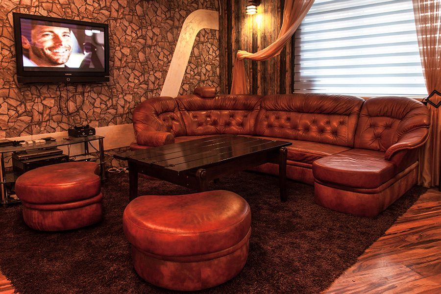 Лаунж-зона отделена от бильярдной изящной барной стойкой и так и манит уставших парильщиков уютно расположиться на мягких кожаных диванах вокруг небольшого столика и заказать что-либо из ассортимента гостиничного ресторана или бара. В зоне отдыха есть ЖК-телевизор и видеоаппаратура, а отдельный выход из банкетного зала на террасу дает возможность прямо на улице приготовить барбекю или шашлык любо заказать эти блюда у местных поваров.